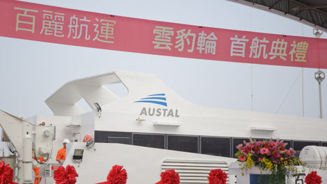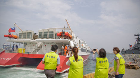 本次「雲豹輪首航典禮」的整體視覺規劃,配合高端雙體高速客輪的科技意象與海洋運輸的專業氛圍,選擇以深藍與金黃作為主色調,象徵海洋的深邃與企業航運的榮耀。